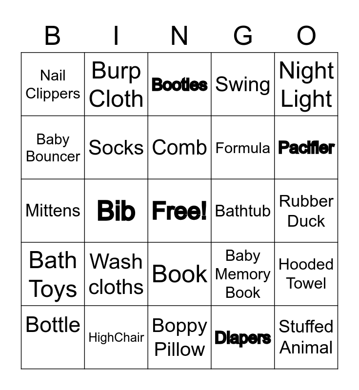 This bingo card has a free space and 29 words: Bottle, Thermometer, Bib, Rattle, Nail Clippers, Booties, Socks, Wash cloths, Bathtub, HighChair, Rubber Duck, Stuffed Animal, Boppy Pillow, Diapers, Pacifier, Blanket, Book, Bath Toys, Night Light, Mittens, Baby Memory Book, Teething Ring, Formula, Baby Bouncer, Swing, Burp Cloth, Hooded Towel, Comb and Hat.