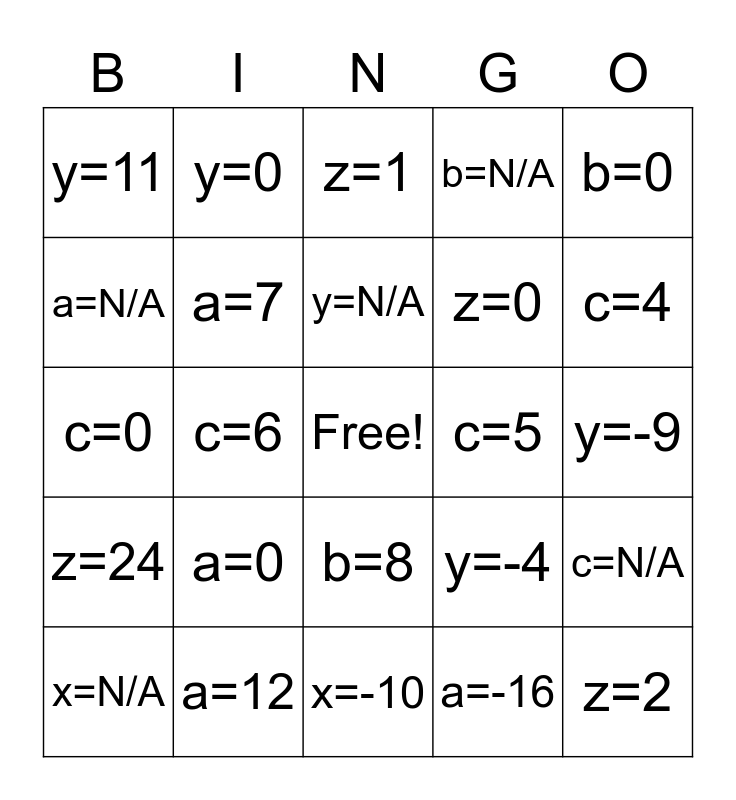 This bingo card has a free space and 30 words: a=12, b=12, c=6, x=3, y=11, z=1, a=7, b=8, c=5, x=-10, y=-9, z=2, a=-16, b=-8, c=4, x=-12, y=-4, z=24, a=0, b=0, c=0, x=0, y=0, z=0, a=N/A, b=N/A, c=N/A, x=N/A, y=N/A and z=N/A.