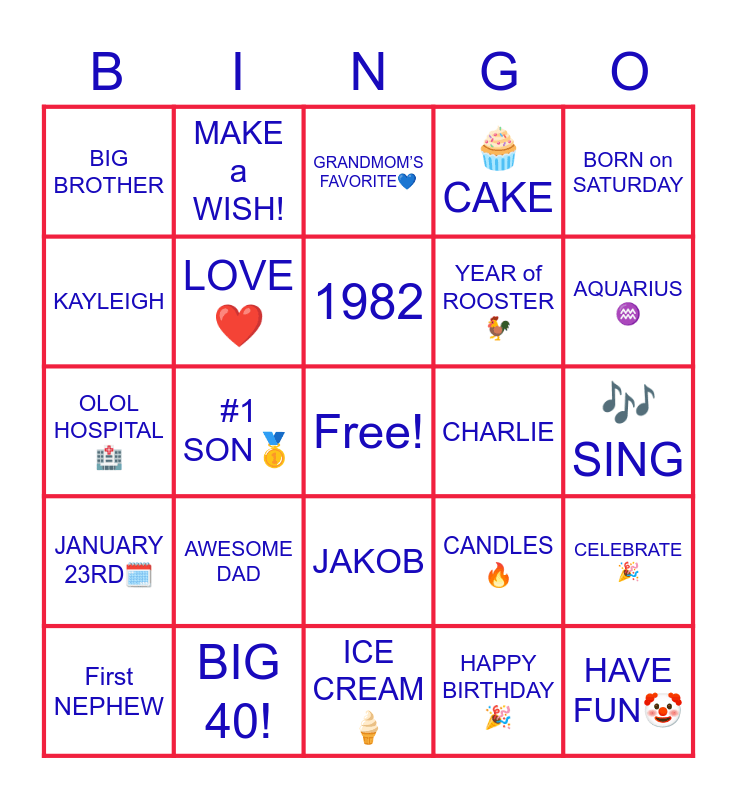 This bingo card has a free space and 24 words: AWESOME DAD, BIG 40!, 1982, First NEPHEW, BORN on SATURDAY, BIG BROTHER, KAYLEIGH, MAKE a WISH!, CHARLIE, JAKOB, YEAR of ROOSTER🐓, OLOL HOSPITAL🏥, CANDLES🔥, CELEBRATE🎉, LOVE❤️, HAPPY BIRTHDAY🎉, 🎶 SING, GRANDMOM’S FAVORITE💙, AQUARIUS ♒️, #1 SON🥇, HAVE FUN🤡, JANUARY 23RD🗓, 🧁 CAKE and ICE CREAM 🍦.