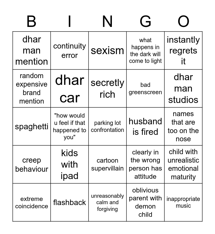 This bingo card has a free space and 24 words: kids with ipad, flashback, secretly rich, extreme coincidence, instantly regrets it, dhar man mention, random expensive brand mention, continuity error, husband is fired, cartoon supervillain, bad greenscreen, spaghetti, clearly in the wrong person has attitude, child with unrealistic emotional maturity, dhar car, oblivious parent with demon child, names that are too on the nose, sexism, dhar man studios, "how would u feel if that happened to you", inappropriate music, creep behaviour, what happens in the dark will come to light and unreasonably calm and forgiving.