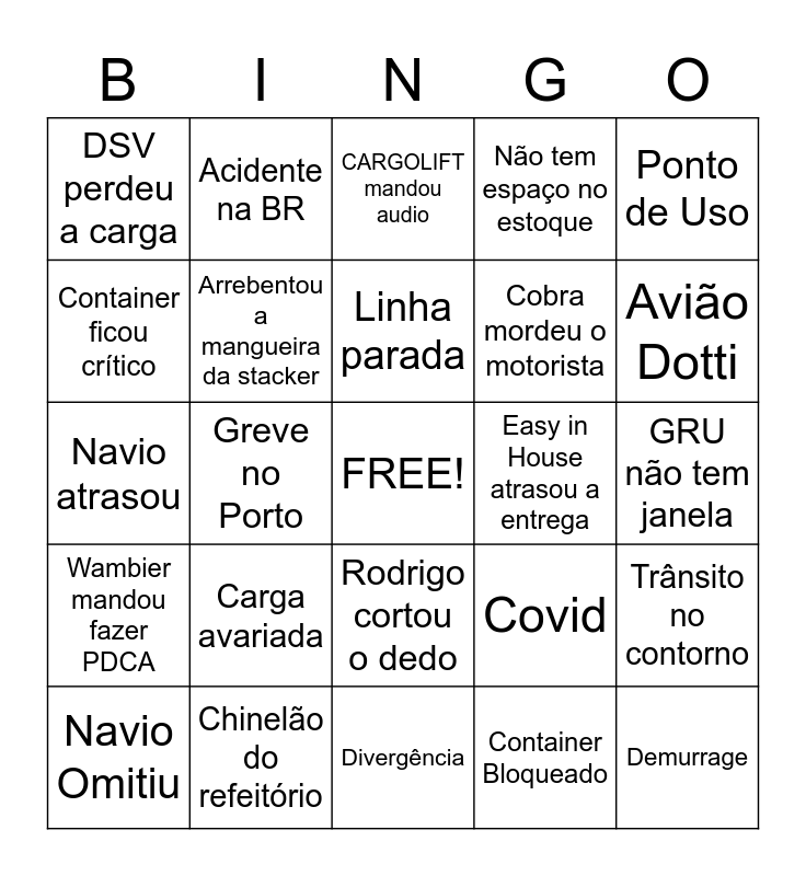 This bingo card has a free space and 29 words: Navio Omitiu, Voo atrasou, Greve no Porto, KTN perdeu a carga, DSV perdeu a carga, CARGOLIFT mandou audio, Arrebentou a mangueira da stacker, Carga avariada, Easy in House atrasou a entrega, Chinelão do refeitório, GRU não tem janela, Demurrage, Divergência, Container Bloqueado, Avião Dotti, Schenker atrasou, Rodrigo cortou o dedo, Wambier mandou fazer PDCA, Ponto de Uso, Navio atrasou, Covid, Mudou a lista de desova, Cobra mordeu o motorista, Container ficou crítico, Não tem espaço no estoque, Acidente na BR, Trânsito no contorno, Linha parada and Divergencia de peso no mantra.