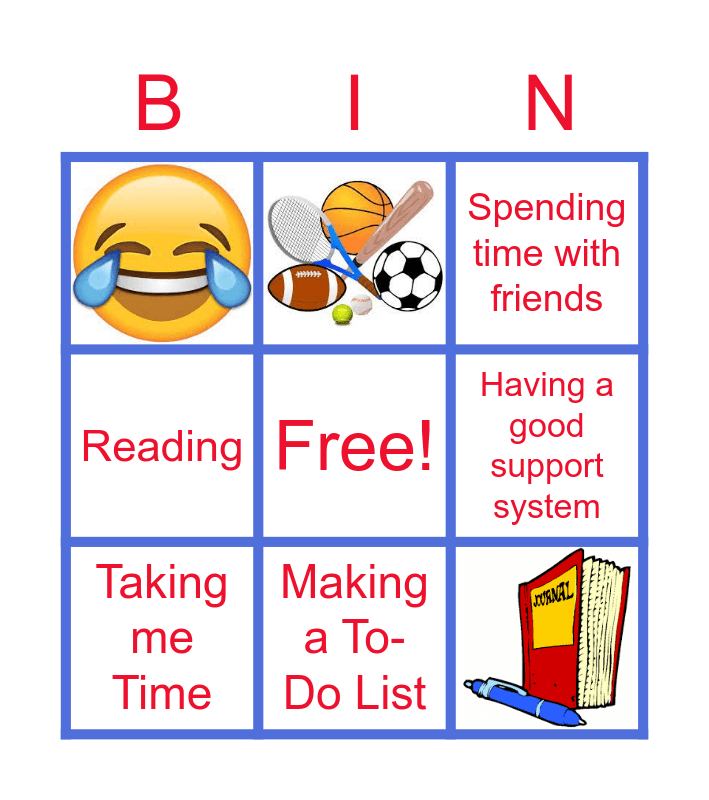 This bingo card has 3 images, a free space and 5 words: Having a good support system, Spending time with friends, Taking me Time, Reading and Making a To-Do List.