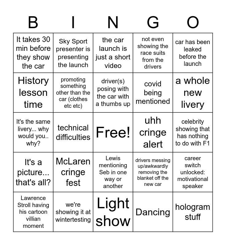 This bingo card has a free space and 24 words: McLaren cringe fest, we're showing it at wintertesting, driver(s) posing with the car with a thumbs up, Lawrence Stroll having his cartoon villian moment, car has been leaked before the launch, It takes 30 min before they show the car, History lesson time, Sky Sport presenter is presenting the launch, uhh cringe alert, Lewis mentioning Seb in one way or another, covid being mentioned, It's the same livery... why would you.. why?, drivers messing up/awkwardly removing the blanket off the new car, career switch unlocked: motivational speaker, promoting something other than the car (clothes etc etc), Dancing, celebrity showing that has nothing to do with F1, the car launch is just a short video, a whole new livery, technical difficulties, hologram stuff, It's a picture... that's all?, not even showing the race suits from the drivers and Light show.