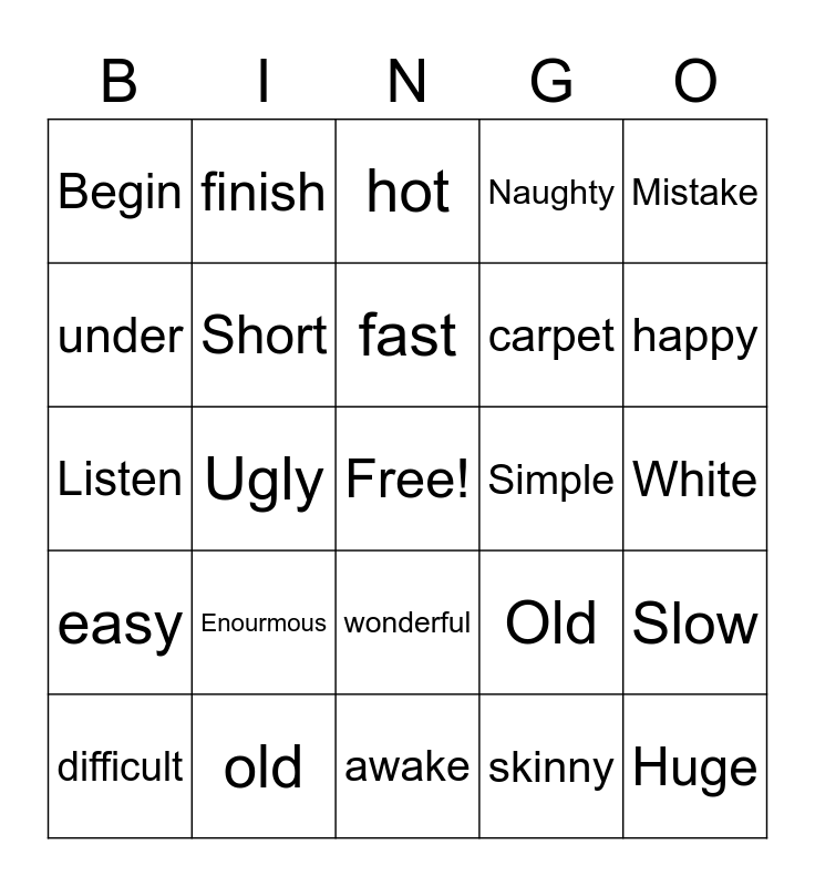 This bingo card has a free space and 24 words: Enourmous, old, fast, difficult, Mistake, Begin, under, finish, Simple, wonderful, carpet, Listen, Old, Slow, Short, skinny, White, hot, happy, Ugly, Huge, easy, Naughty and awake.