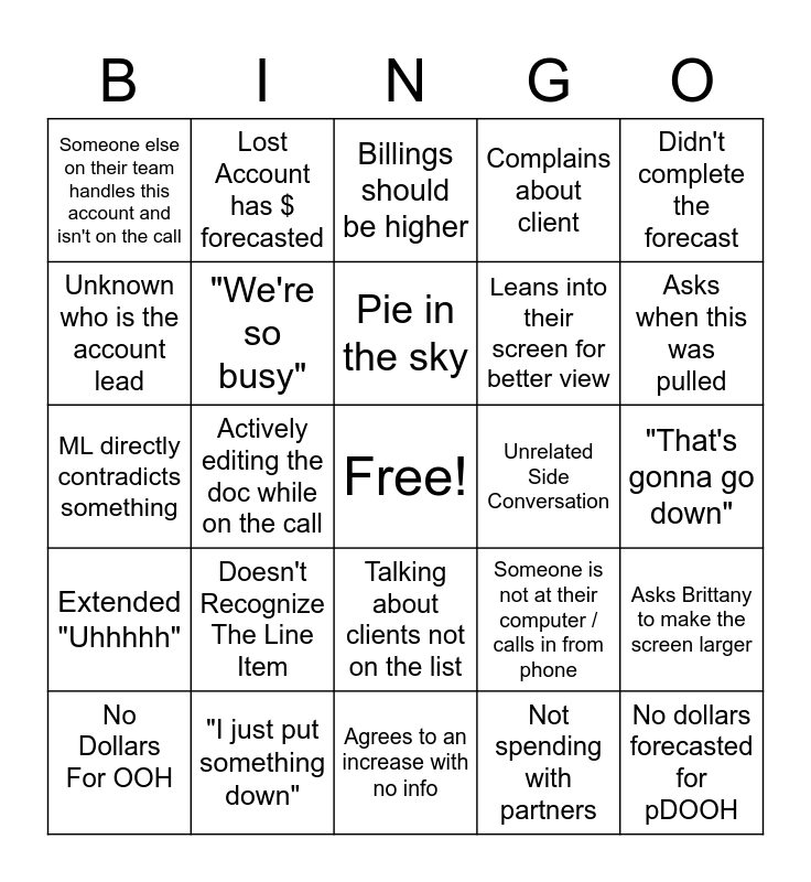 This bingo card has a free space and 24 words: Doesn't Recognize The Line Item, "I just put something down", Pie in the sky, No Dollars For OOH, Didn't complete the forecast, Someone else on their team handles this account and isn't on the call, Unknown who is the account lead, Lost Account has $ forecasted, Unrelated Side Conversation, Talking about clients not on the list, Leans into their screen for better view, ML directly contradicts something, Someone is not at their computer / calls in from phone, Asks Brittany to make the screen larger, "We're so busy", Not spending with partners, "That's gonna go down", Billings should be higher, Asks when this was pulled, Actively editing the doc while on the call, No dollars forecasted for pDOOH, Extended "Uhhhhh", Complains about client and Agrees to an increase with no info.