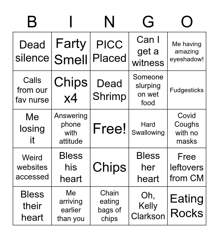 This bingo card has a free space and 24 words: Bless his heart, Me arriving earlier than you, Dead Shrimp, Bless their heart, Me having amazing eyeshadow!, Dead silence, Calls from our fav nurse, Farty Smell, Hard Swallowing, Chips, Someone slurping on wet food, Me losing it, Bless her heart, Free leftovers from CM, Chips x4, Oh, Kelly Clarkson, Covid Coughs with no masks, PICC Placed, Fudgesticks, Answering phone with attitude, Eating Rocks, Weird websites accessed, Can I get a witness and Chain eating bags of chips.