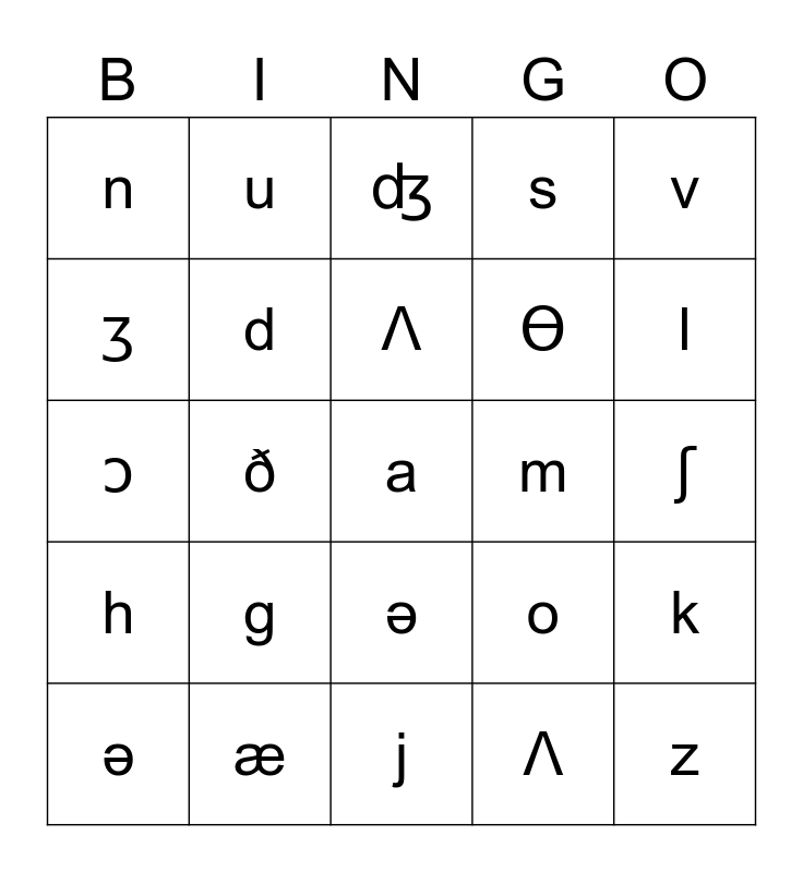 This bingo card has 17 images, a free space and 38 words: p, b, t, d, k, g, Ʌ, f, v, Ɵ, ð, s, z, ʃ, ʒ, h, ʧ, ʤ, ɾ, m, n, æ, l, ə, w, j, ɪ, i, e, Ɛ, æ, ə, Ʌ, u, ʊ, o, ɔ and a.