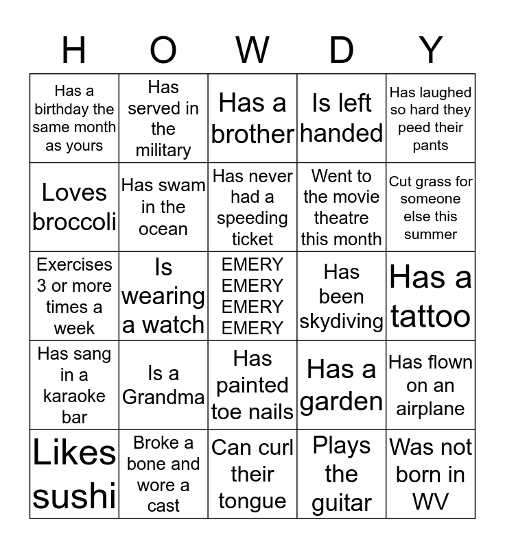 This bingo card has a free space and 24 words: Is a Grandma, Broke a bone and wore a cast, Has never had a speeding ticket, Likes sushi, Has laughed so hard they peed their pants, Has a birthday the same month as yours, Loves broccoli, Has served in the military, Has been skydiving, Has painted toe nails, Went to the movie theatre this month, Exercises 3 or more times a week, Has a garden, Has flown on an airplane, Has swam in the ocean, Plays the guitar, Has a tattoo, Has a brother, Cut grass for someone else this summer, Is wearing a watch, Was not born in WV, Has sang in a karaoke bar, Is left handed and Can curl their tongue.