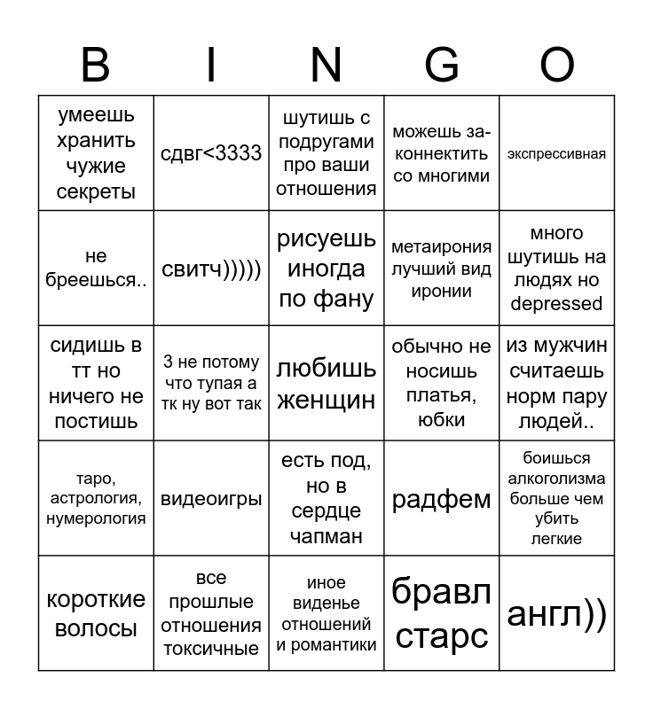 This bingo card has a free space and 24 words: видеоигры, все прошлые отношения токсичные, рисуешь иногда по фану, короткие волосы, экспрессивная, умеешь хранить чужие секреты, не бреешься.., сдвг<3333, обычно не носишь платья, юбки, есть под, но в сердце чапман, метаирония лучший вид иронии, сидишь в тт но ничего не постишь, радфем, боишься алкоголизма больше чем убить легкие, свитч))))), бравл старс, из мужчин считаешь норм пару людей.., шутишь с подругами про ваши отношения, много шутишь на людях но depressed, 3 не потому что тупая а тк ну вот так, англ)), таро, астрология, нумерология, можешь за- коннектить со многими and иное виденье отношений и романтики.