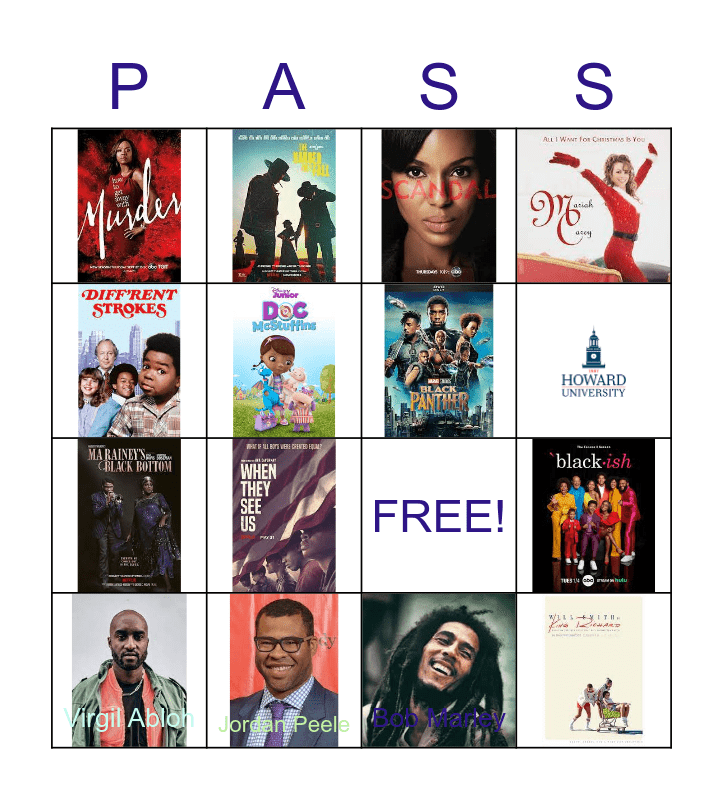 This bingo card has 15 images and 4 words: Jordan Peele, FREE!, Bob Marley and Virgil Abloh.