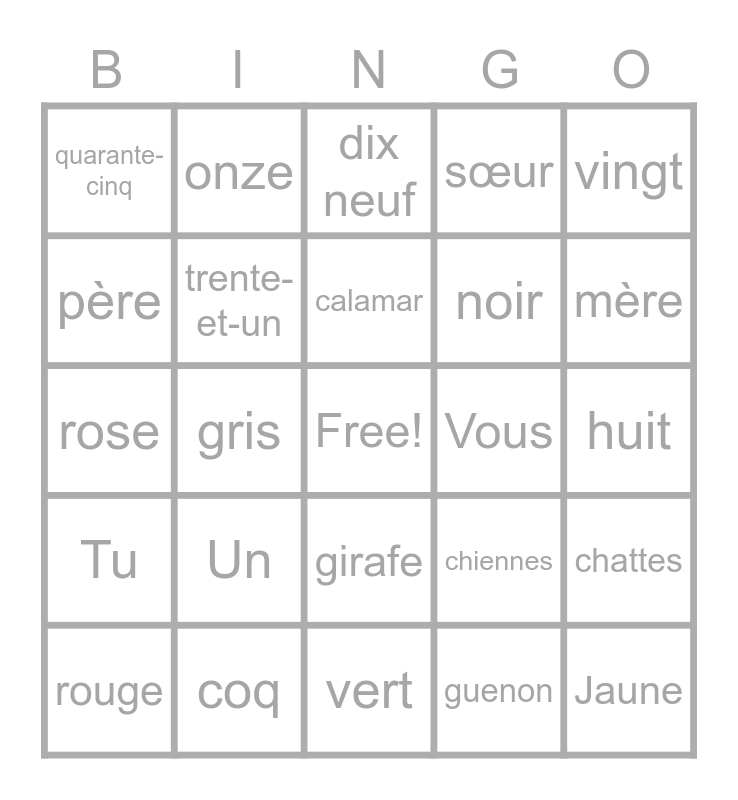 This bingo card has a free space and 24 words: Un, coq, calamar, rouge, vingt, quarante-cinq, père, onze, Vous, girafe, noir, rose, chiennes, chattes, trente-et-un, guenon, huit, dix neuf, mère, gris, Jaune, Tu, sœur and vert.