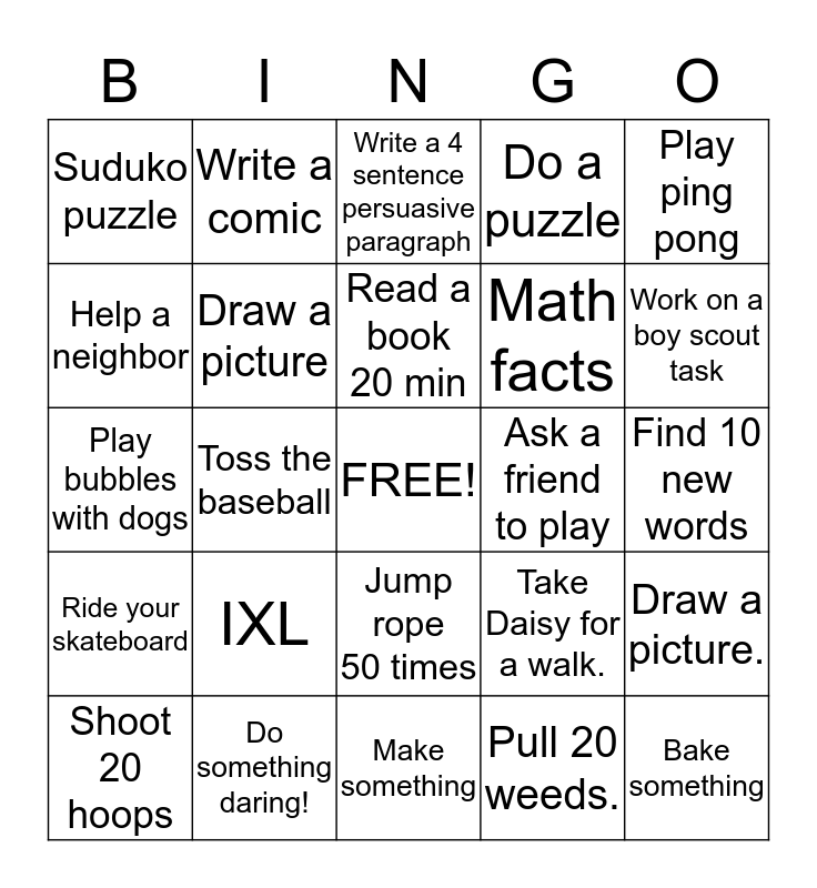 This bingo card has a free space and 24 words: IXL, Do something daring!, Read a book 20 min, Shoot 20 hoops, Play ping pong, Suduko puzzle, Help a neighbor, Write a comic, Ask a friend to play, Jump rope 50 times, Math facts, Play bubbles with dogs, Take Daisy for a walk., Draw a picture., Draw a picture, Pull 20 weeds., Find 10 new words, Write a 4 sentence persuasive paragraph, Work on a boy scout task, Toss the baseball, Bake something, Ride your skateboard, Do a puzzle and Make something.