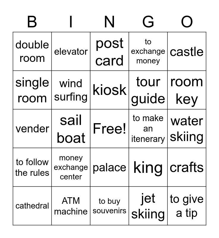 This bingo card has a free space and 24 words: money exchange center, ATM machine, kiosk, cathedral, castle, double room, single room, elevator, to make an itenerary, palace, tour guide, vender, king, crafts, wind surfing, jet skiing, water skiing, post card, room key, sail boat, to give a tip, to follow the rules, to exchange money and to buy souvenirs.