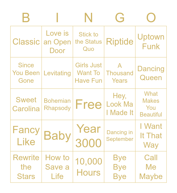 This bingo card has a free space and 42 words: I want to dance with somebody, Girls Just Want To Have Fun, Watermelon Sugar, Baby, Bye Bye Bye, I Want It That Way, Call Me Maybe, We're All In This Together, Stick to the Status Quo, Year 3000, What Makes You Beautiful, Dancing Queen, Bohemian Rhapsody, Uptown Funk, Adore You, Dancing in September, A Whole New World, Sweet Carolina, Fresh Prince of Bel-Air, Love is an Open Door, Since You Been Gone, Party in the USA, Dynamite, Classic, Glad You Came, Can't Stop the Feeling, A Thousand Years, Shut Up and Dance, Poor Unfortunate Souls, Hello, Wagon Wheel, Fancy Like, Levitating, 10,000 Hours, Out of My League, Rewrite the Stars, How to Save a Life, Hey, Look Ma I Made It, You Belong with Me, Can I Call You Tonight, Riptide and Shotgun.