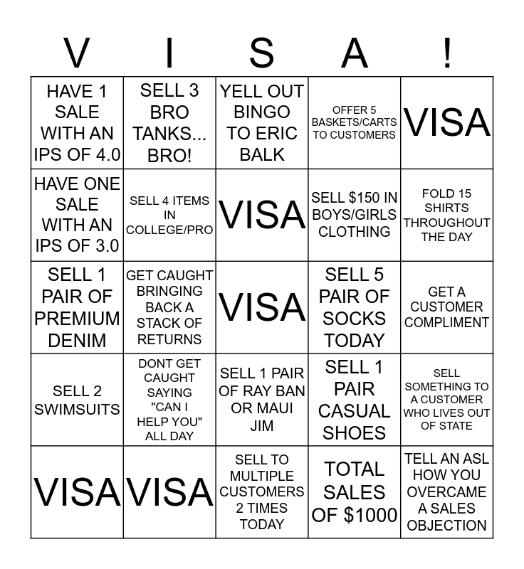 This bingo card has a free space and 24 words: DONT GET CAUGHT SAYING "CAN I HELP YOU" ALL DAY, VISA, VISA, VISA, VISA, HAVE 1 SALE WITH AN IPS OF 4.0, HAVE ONE SALE WITH AN IPS OF 3.0, SELL 3 BRO TANKS... BRO!, SELL 5 PAIR OF SOCKS TODAY, SELL 1 PAIR OF RAY BAN OR MAUI JIM, SELL $150 IN BOYS/GIRLS CLOTHING, SELL 1 PAIR OF PREMIUM DENIM, SELL 1 PAIR CASUAL SHOES, SELL SOMETHING TO A CUSTOMER WHO LIVES OUT OF STATE, SELL 4 ITEMS IN COLLEGE/PRO, TOTAL SALES OF $1000, GET A CUSTOMER COMPLIMENT, YELL OUT BINGO TO ERIC BALK, FOLD 15 SHIRTS THROUGHOUT THE DAY, GET CAUGHT BRINGING BACK A STACK OF RETURNS, TELL AN ASL HOW YOU OVERCAME A SALES OBJECTION, SELL 2 SWIMSUITS, OFFER 5 BASKETS/CARTS TO CUSTOMERS and SELL TO MULTIPLE CUSTOMERS 2 TIMES TODAY.