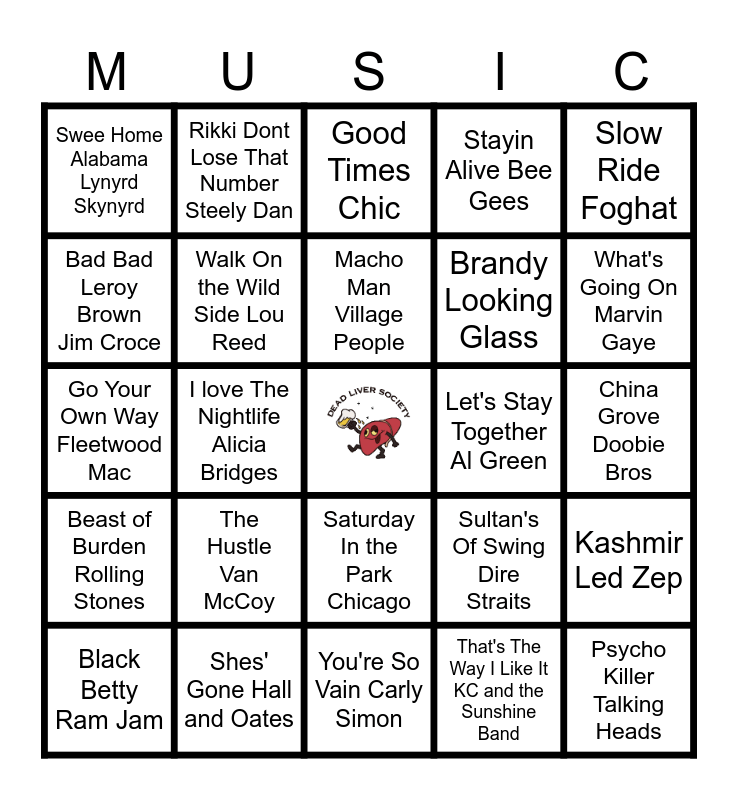 This bingo card has a free space and 45 words: Stuck in the Middle with You Stealers Wheel, Psycho Killer Talking Heads, Low Rider War, Black Betty Ram Jam, Da Ya Think Im Sexy Rod Stewart, That's The Way I Like It KC and the Sunshine Band, Good Times Chic, Grease Frankie Valli, Slow Ride Foghat, Shes' Gone Hall and Oates, Stayin Alive Bee Gees, Let's Stay Together Al Green, Saturday In the Park Chicago, The Hustle Van McCoy, Fame David Bowie, You're So Vain Carly Simon, American Pie Don Mclean, Go Your Own Way Fleetwood Mac, Bang a Gong T.Rex, What's Going On Marvin Gaye, Rikki Dont Lose That Number Steely Dan, A Horse With No Name America, Babe Styx, Swee Home Alabama Lynyrd Skynyrd, Takin Care of Business BTO, China Grove Doobie Bros, Take the Money and Run Steve Miller Band, Rhiannon Fleetwood Mac, Sultan's Of Swing Dire Straits, Beast of Burden Rolling Stones, Jamies' Crying Van Halen, Kashmir Led Zep, Lola The Kinks, Dont Go Breaking My Heart Elton John and Kiki, Ladies Night Kool and the Gang, I love The Nightlife Alicia Bridges, Funkytown Lipps Inc, Cant Get Enough of Your Love, Babe Barry White, Copacabana Barry Manilow, Macho Man Village People, Bad Bad Leroy Brown Jim Croce, Brandy Looking Glass, Got to Be Real Cheryl Lynn, Walk On the Wild Side Lou Reed and Long Cool Woman The Hollies.