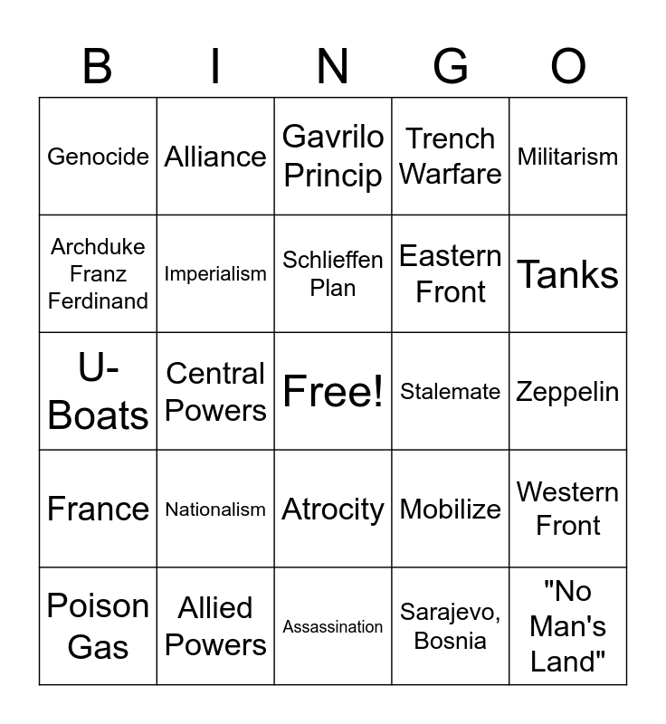 This bingo card has a free space and 24 words: Nationalism, Allied Powers, Schlieffen Plan, Poison Gas, Militarism, Genocide, Archduke Franz Ferdinand, Alliance, Stalemate, Atrocity, Eastern Front, U-Boats, Mobilize, Western Front, Imperialism, Sarajevo, Bosnia, Zeppelin, Gavrilo Princip, Tanks, Central Powers, "No Man's Land", France, Trench Warfare and Assassination.