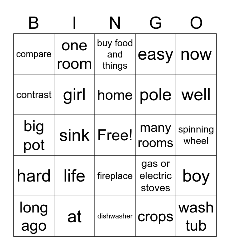 This bingo card has a free space and 24 words: life, at, home, long ago, now, compare, contrast, one room, many rooms, fireplace, pole, big pot, gas or electric stoves, boy, girl, crops, spinning wheel, buy food and things, well, sink, wash tub, hard, easy and dishwasher.