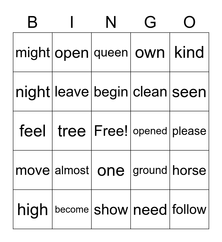 This bingo card has a free space and 24 words: almost, become, begin, high, kind, might, night, open, opened, one, clean, feel, ground, horse, leave, need, please, queen, seen, tree, follow, move, own and show.