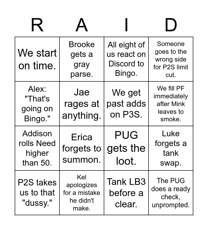 This bingo card has 16 words: Kel apologizes for a mistake he didn't make., Luke forgets a tank swap., All eight of us react on Discord to Bingo., We start on time., Addison rolls Need higher than 50., Brooke gets a gray parse., PUG gets the loot., Tank LB3 before a clear., Alex: "That's going on Bingo.", Jae rages at anything., P2S takes us to that "dussy.", Someone goes to the wrong side for P2S limit cut., Erica forgets to summon., We fill PF immediately after Mink leaves to smoke., We get past adds on P3S. and The PUG does a ready check, unprompted..
