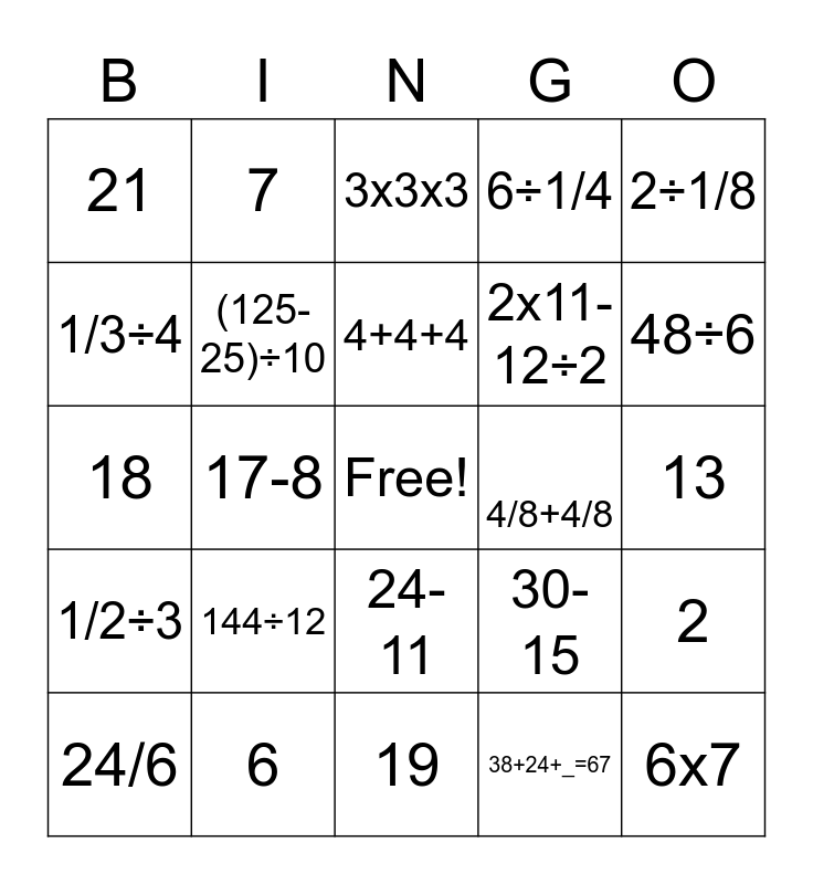 This bingo card has a free space and 24 words: 144÷12, 6, 4+4+4, 24/6, 2÷1/8, 21, 1/3÷4, 7, 4/8+4/8, 24-11, 2x11-12÷2, 18, 30-15, 2, (125-25)÷10, 38+24+_=67, 13, 3x3x3, 48÷6, 17-8, 6x7, 1/2÷3, 6÷1/4 and 19.