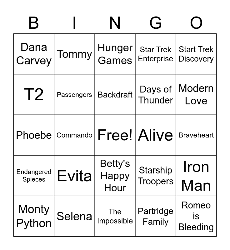 This bingo card has a free space and 64 words: 10 Cloverfield Lane, Million ways to die, A River Runs Through it, Iron Man, AVP, Coyote Ugly, Tommy, Armageddon, Backdraft, Batman Returns, Betty's Happy Hour, Bob Saget, Braveheart, Start Trek Discovery, SNL, T2, Commando, Dana Carvey, Dances With Wolves, Days of Thunder, Evita, Endangered Spieces, Star Trek Enterprise, Family Guy, Fatal Attraction, Fire Down Below, George Carlin, Home Improvement, Jen Kirkman, Kill Bill Vol 2, Cocktail, Amusement, Major League, Marilyn, Modern Love, Monty Python, Streets of Fire, Partridge Family, Pam & Tommy, Passengers, Phoebe, Alive, Raiders of the lost Ark, Red Dawn, Rocketman, Romeo is Bleeding, Selena, Spaceballs, Starship Troopers, The Hangover, The Birdcage, The Fourth Kind, The Impossible, The Love Guru, The Postman, Rocky Horror, Hunger Games, Tommy Boy, We're the Millers, True Lies, Venom ~ Carnage, Walking Tall, Wanda Sykes and Ghost Whisper.