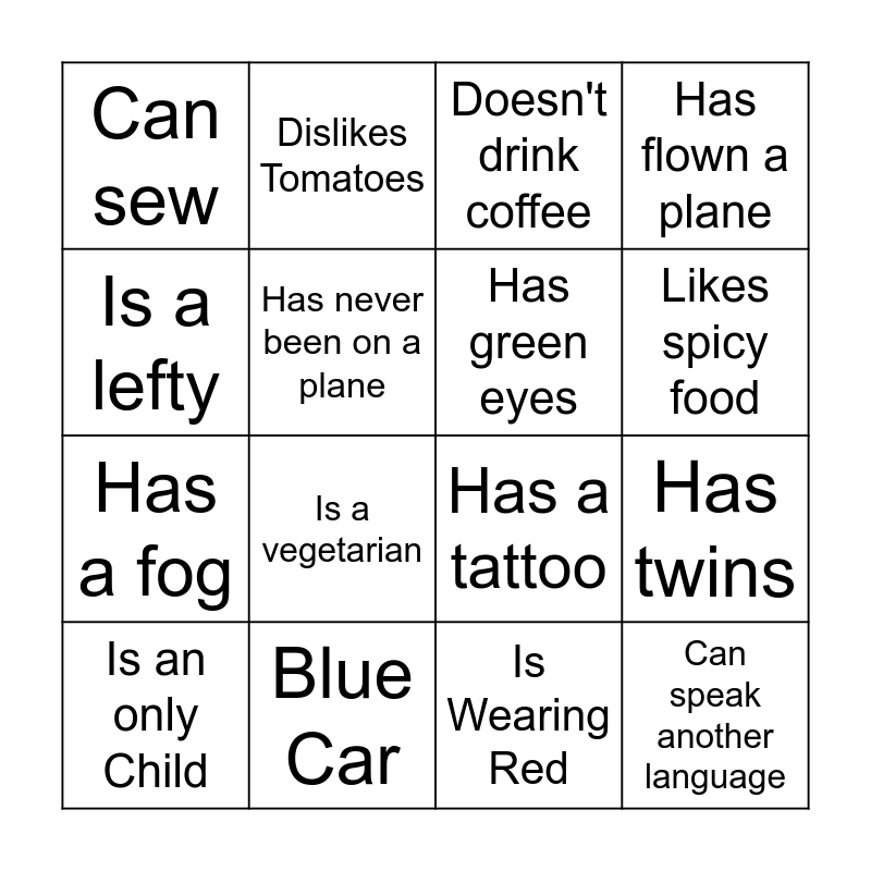 This bingo card has 21 words: Blue Car, Has climbed Mt Ngungun, Dislikes Tomatoes, Has a twin, Is Wearing Red, Has green eyes, Can sew, Doesn't drink coffee, Has a tattoo, Likes spicy food, Has a fog, Has flown a plane, Can speak another language, Can surf, Has never been on a plane, Has a Birthday this month, Is an only Child, Is a vegetarian, Is a lefty, Has twins and Has a cat allergy.