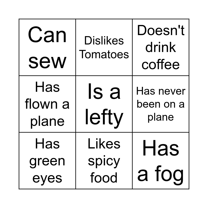This bingo card has 21 words: Blue Car, Has climbed Mt Ngungun, Dislikes Tomatoes, Has a twin, Is Wearing Red, Has green eyes, Can sew, Doesn't drink coffee, Has a tattoo, Likes spicy food, Has a fog, Has flown a plane, Can speak another language, Can surf, Has never been on a plane, Has a Birthday this month, Is an only Child, Is a vegetarian, Is a lefty, Has twins and Has a cat allergy.