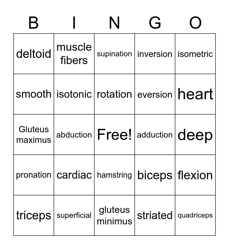 This bingo card has a free space and 24 words: cardiac, superficial, rotation, triceps, isometric, deltoid, smooth, muscle fibers, adduction, hamstring, eversion, Gluteus maximus, biceps, flexion, isotonic, striated, deep, supination, heart, abduction, quadriceps, pronation, inversion and gluteus minimus.