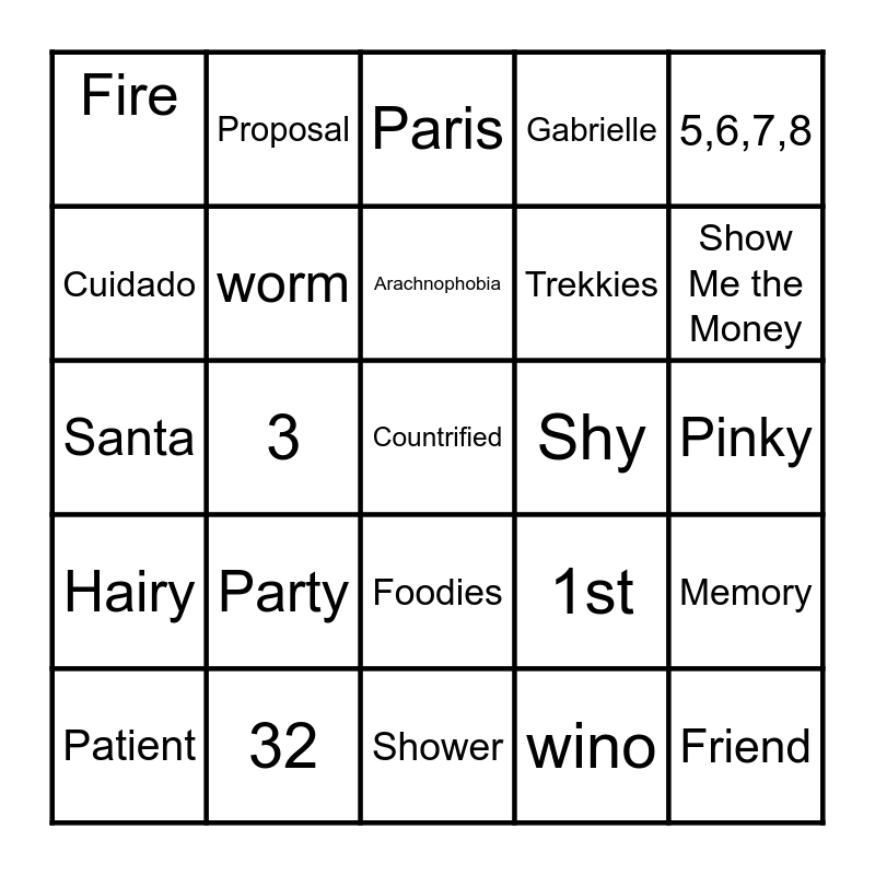 This bingo card has 30 words: 32, NO, 3, Chillax, Fire, Paris, worm, Foodies, Shy, Shower, Pinky, Countrified, wino, Friend, Show Me the Money, Patient, 1st, Hairy, Party, 5,6,7,8, Santa, Shy, Proposal, Trekkies, Cuidado, Gabrielle, Memory, Patient, Arachnophobia and Ouch.