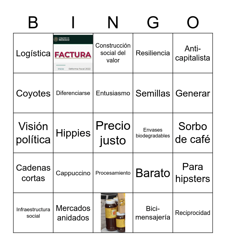 This bingo card has 3 images and 32 words: Rábano, solidaridad, Tianguis, Diferenciarse, Procesamiento, Resiliencia, Coyotes, Salmonella, Entusiasmo, Diversificación, Visión política, Anti-capitalista, Encuentro, Calidez humana, Logística, Envases biodegradables, Bici-mensajería, Hippies, Cadenas cortas, Precio justo, Barato, Infraestructura social, Para hipsters, Mercados anidados, Construcción social del valor, Generar, Reciprocidad, Nicho, Semillas, Sorbo de café, Cappuccino and Chorizo.