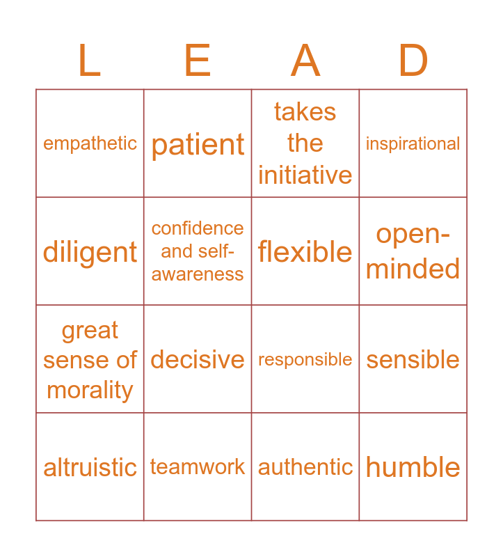 This bingo card has 16 words: teamwork, sensible, takes the initiative, empathetic, great sense of morality, patient, responsible, authentic, diligent, confidence and self-awareness, altruistic, inspirational, decisive, open-minded, flexible and humble.