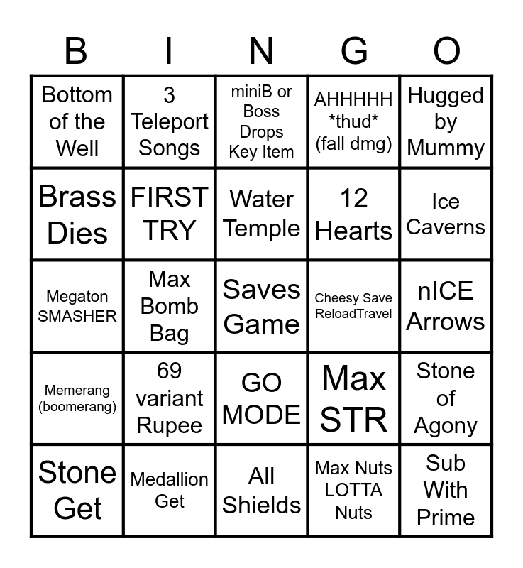 This bingo card has a free space and 36 words: Void out falling, UWEEH (Move KingZora), Wallet Upgrade, FIRST TRY, Max STR, Memerang (boomerang), Water Temple, Sun Song, Hugged by Mummy, Hugged by Zombie, Max Bomb Bag, AHHHHH *thud* (fall dmg), Self-Explosion, Cheesy Save ReloadTravel, Ice Caverns, Bottom of the Well, Fairy in a bottle, 69 variant Rupee, Sub With Prime, miniB or Boss Drops Key Item, nICE Arrows, Stone of Agony, Medallion Get, Stone Get, All Shields, 3 Teleport Songs, Megaton SMASHER, 8 Hearts, 12 Hearts, Brass Dies, Double Defense, WHAT'RE THOSE (Irons&Hovers), Max Nuts LOTTA Nuts, GO MODE, Hit by a BAT and ICE TRAP.