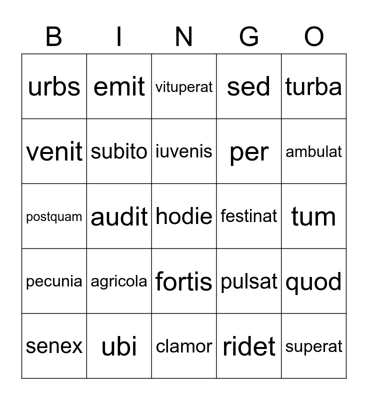 This bingo card has 25 words: agricola, clamor, iuvenis, senex, turba, urbs, venit, emit, festinat, fortis, per, postquam, pulsat, quod, subito, superat, tum, vituperat, ambulat, audit, hodie, ubi, pecunia, sed and ridet.