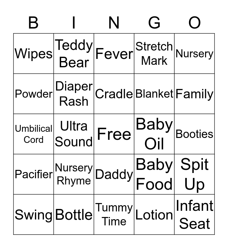 This bingo card has a free space and 24 words: Nursery Rhyme, Bottle, Cradle, Swing, Nursery, Wipes, Powder, Teddy Bear, Baby Oil, Daddy, Blanket, Umbilical Cord, Baby Food, Spit Up, Diaper Rash, Lotion, Booties, Fever, Family, Ultra Sound, Infant Seat, Pacifier, Stretch Mark and Tummy Time.