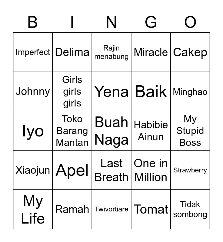 This bingo card has a free space and 24 words: Apel, Ramah, Yena, My Life, Cakep, Imperfect, Johnny, Delima, Habibie Ainun, Last Breath, Baik, Iyo, One in Million, Strawberry, Girls girls girls, Tomat, My Stupid Boss, Rajin menabung, Minghao, Toko Barang Mantan, Tidak sombong, Xiaojun, Miracle and Twivortiare.