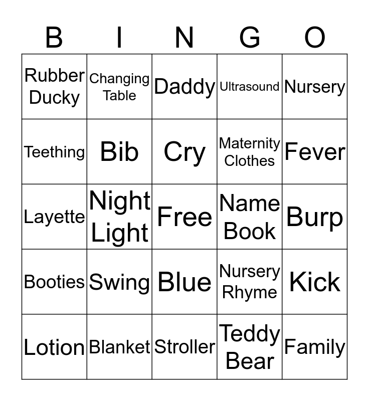 This bingo card has a free space and 24 words: Swing, Blanket, Cry, Lotion, Nursery, Rubber Ducky, Teething, Changing Table, Name Book, Blue, Maternity Clothes, Layette, Nursery Rhyme, Kick, Bib, Teddy Bear, Burp, Daddy, Fever, Night Light, Family, Booties, Ultrasound and Stroller.