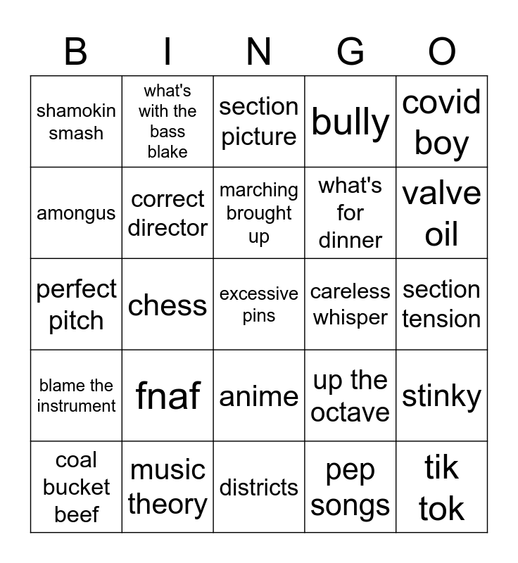 This bingo card has a free space and 24 words: fnaf, music theory, marching brought up, coal bucket beef, covid boy, shamokin smash, amongus, what's with the bass blake, careless whisper, anime, what's for dinner, perfect pitch, up the octave, stinky, correct director, pep songs, section tension, section picture, valve oil, chess, tik tok, blame the instrument, bully and districts.