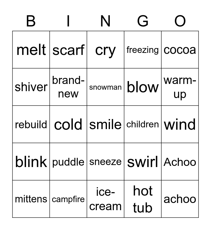 This bingo card has 26 words: sneeze, hot tub, snowman, campfire, cocoa, melt, shiver, scarf, wind, swirl, blow, rebuild, Achoo, mittens, cold, coat, freezing, blink, cry, smile, warm-up, ice-cream, children, puddle, brand-new and achoo.