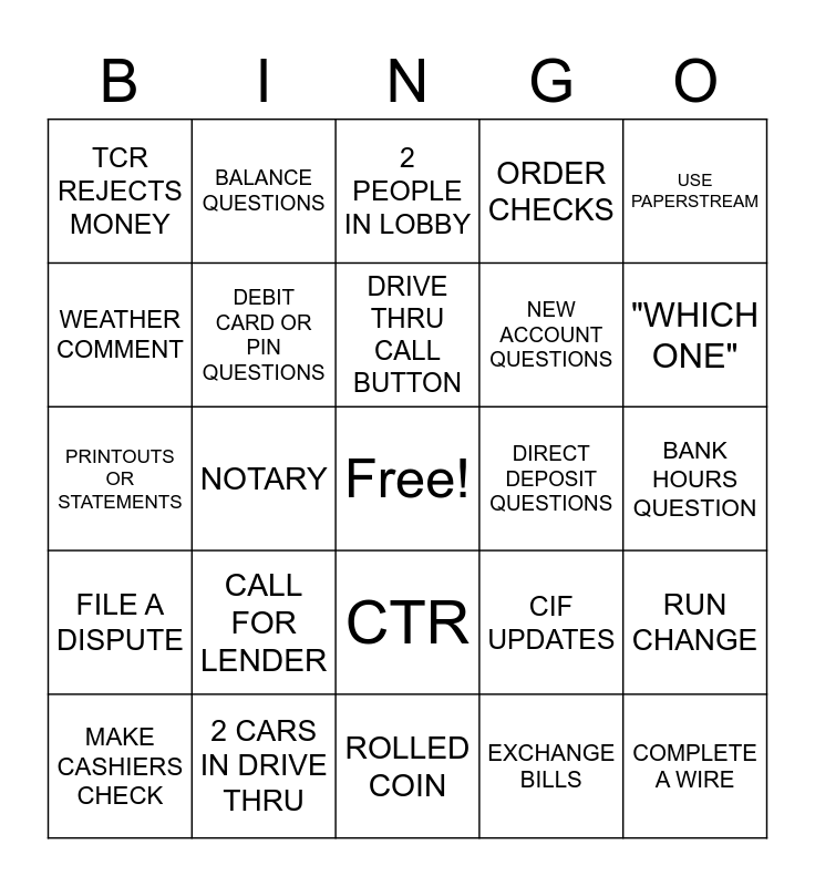 This bingo card has a free space and 24 words: CALL FOR LENDER, 2 CARS IN DRIVE THRU, DRIVE THRU CALL BUTTON, MAKE CASHIERS CHECK, USE PAPERSTREAM, TCR REJECTS MONEY, WEATHER COMMENT, BALANCE QUESTIONS, DIRECT DEPOSIT QUESTIONS, CTR, NEW ACCOUNT QUESTIONS, PRINTOUTS OR STATEMENTS, CIF UPDATES, RUN CHANGE, DEBIT CARD OR PIN QUESTIONS, EXCHANGE BILLS, BANK HOURS QUESTION, 2 PEOPLE IN LOBBY, "WHICH ONE", NOTARY, COMPLETE A WIRE, FILE A DISPUTE, ORDER CHECKS and ROLLED COIN.