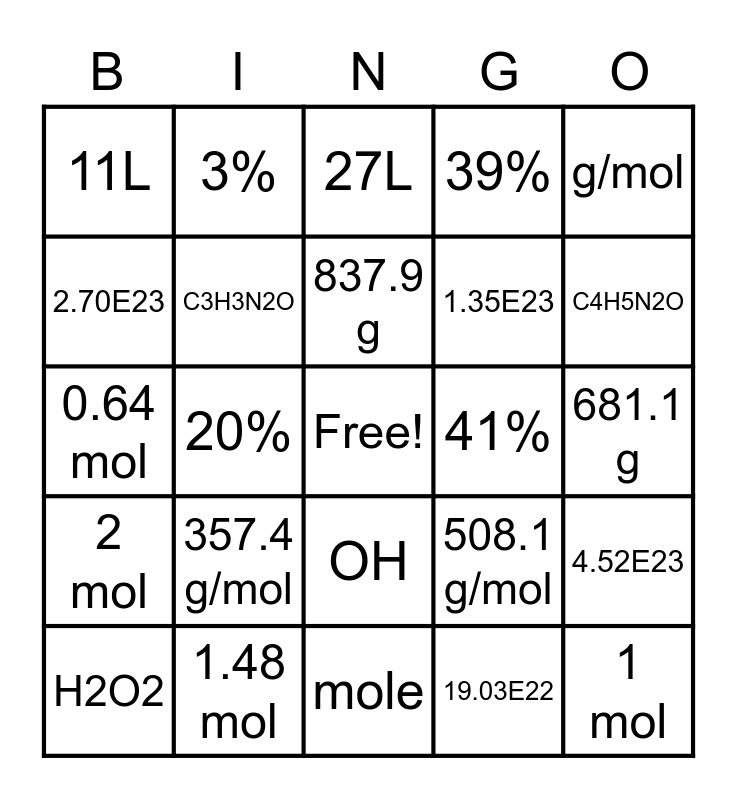 This bingo card has a free space and 24 words: 357.4 g/mol, 1.48 mol, 837.9 g, H2O2, g/mol, 11L, 2.70E23, 3%, 41%, OH, 1.35E23, 0.64 mol, 508.1 g/mol, 4.52E23, C3H3N2O, 19.03E22, 681.1 g, 27L, C4H5N2O, 20%, 1 mol, 2 mol, 39% and mole.
