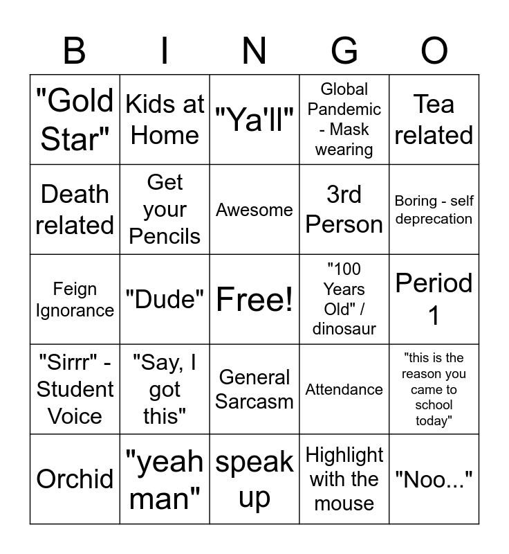 This bingo card has a free space and 24 words: "Say, I got this", "yeah man", Awesome, Orchid, Tea related, "Gold Star", Death related, Kids at Home, "100 Years Old" / dinosaur, General Sarcasm, 3rd Person, Feign Ignorance, Attendance, "this is the reason you came to school today", Get your Pencils, Highlight with the mouse, Period 1, "Ya'll", Boring - self deprecation, "Dude", "Noo...", "Sirrr" - Student Voice, Global Pandemic - Mask wearing and speak up.