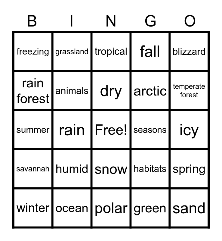 This bingo card has a free space and 27 words: habitats, desert, arctic, polar, rain forest, tropical, grassland, savannah, seasons, spring, summer, fall, winter, ocean, temperate forest, aquatic, animals, dry, humid, freezing, icy, green, rain, sand, snow, blizzard and flood.