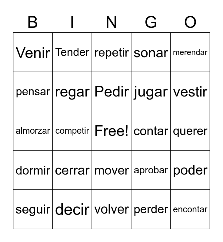 This bingo card has a free space and 24 words: cerrar, decir, Pedir, seguir, merendar, Venir, pensar, Tender, contar, mover, jugar, almorzar, aprobar, poder, regar, perder, querer, repetir, vestir, competir, encontar, dormir, sonar and volver.