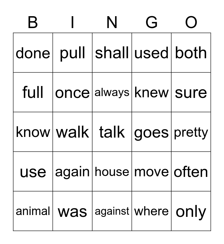 This bingo card has 25 words: again, against, always, animal, both, done, full, pull, goes, house, knew, know, move, often, once, only, pretty, shall, sure, walk, talk, was, use, used and where.