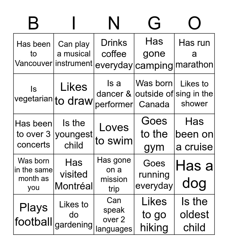 This bingo card has 25 words: Has visited Montréal, Can speak over 2 languages, Is a dancer & performer, Plays football, Has run a marathon, Has been to Vancouver, Is vegetarian, Can play a musical instrument, Goes to the gym, Has gone on a mission trip, Was born outside of Canada, Has been to over 3 concerts, Goes running everyday, Has a dog, Likes to draw, Is the oldest child, Has been on a cruise, Drinks coffee everyday, Likes to sing in the shower, Is the youngest child, Loves to swim, Likes to do gardening, Was born in the same month as you, Has gone camping and Likes to go hiking.