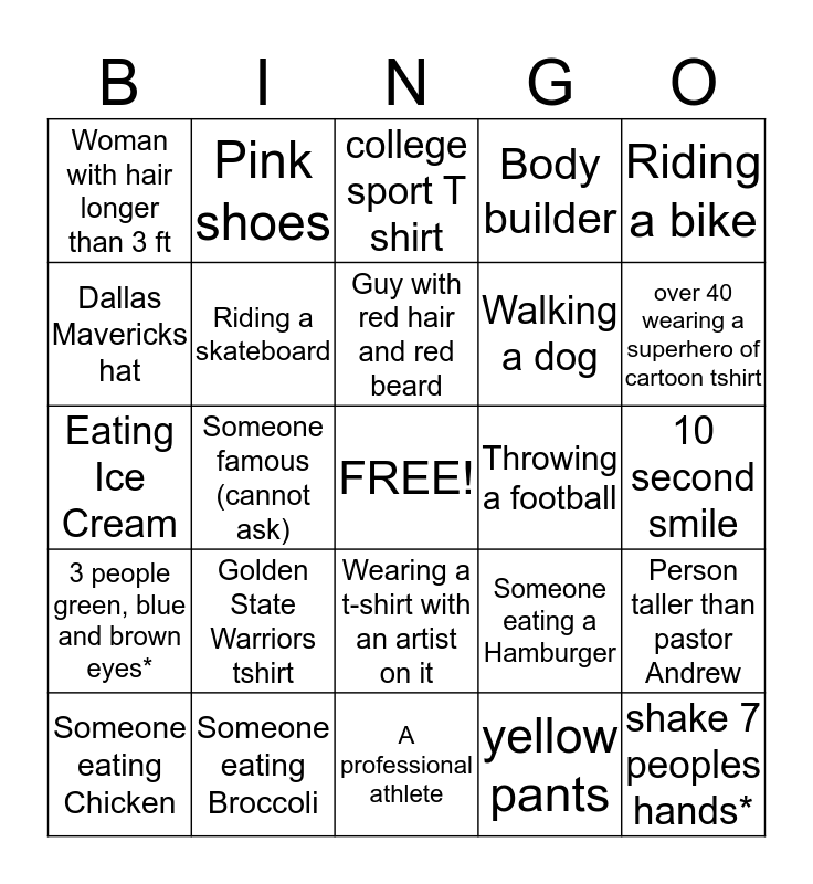 This bingo card has a free space and 24 words: Golden State Warriors tshirt, Someone eating Broccoli, Guy with red hair and red beard, Someone eating Chicken, Riding a bike, Woman with hair longer than 3 ft, Dallas Mavericks hat, Pink shoes, Throwing a football, Wearing a t-shirt with an artist on it, Walking a dog, Eating Ice Cream, Someone eating a Hamburger, Person taller than pastor Andrew, Riding a skateboard, yellow pants, 10 second smile, college sport T shirt, over 40 wearing a superhero of cartoon tshirt, Someone famous (cannot ask), shake 7 peoples hands*, 3 people green, blue and brown eyes*, Body builder and A professional athlete.