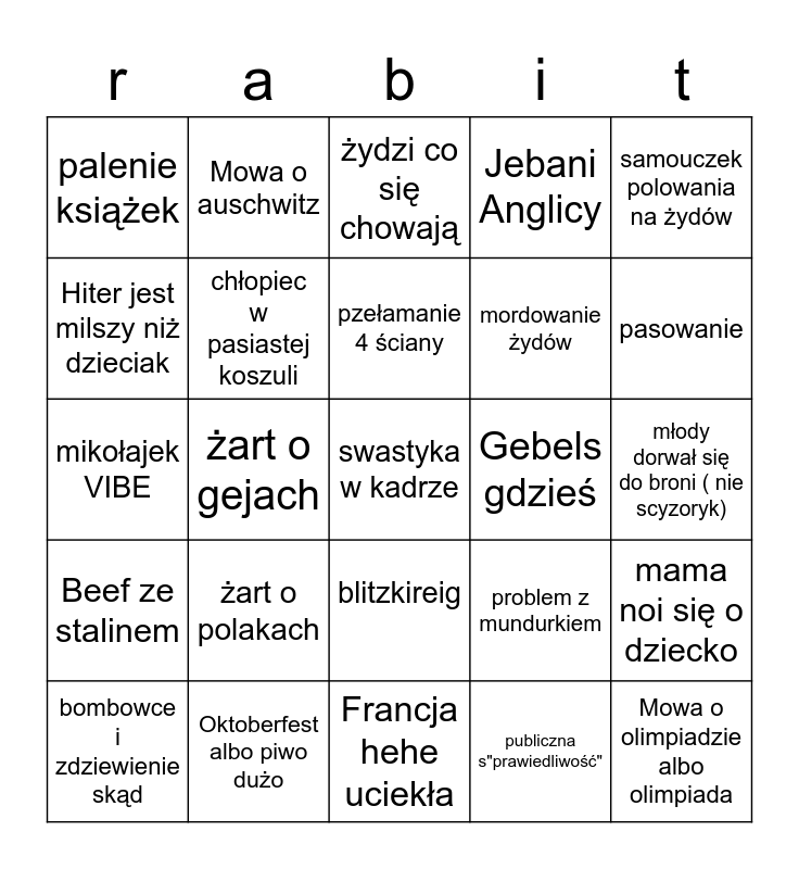 This bingo card has a free space and 24 words: żart o polakach, Oktoberfest albo piwo dużo, pzełamanie 4 ściany, bombowce i zdziewienie skąd, samouczek polowania na żydów, palenie książek, Hiter jest milszy niż dzieciak, Mowa o auschwitz, Gebels gdzieś, blitzkireig, mordowanie żydów, mikołajek VIBE, problem z mundurkiem, mama noi się o dziecko, chłopiec w pasiastej koszuli, publiczna s"prawiedliwość", młody dorwał się do broni ( nie scyzoryk), żydzi co się chowają, pasowanie, żart o gejach, Mowa o olimpiadzie albo olimpiada, Beef ze stalinem, Jebani Anglicy and Francja hehe uciekła.