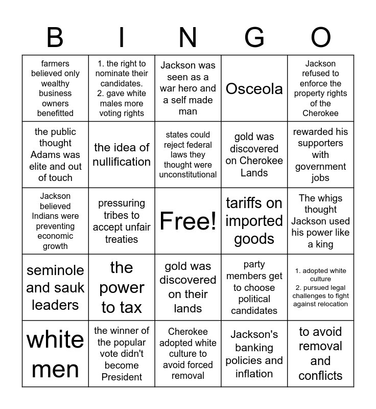 This bingo card has a free space and 27 words: party members get to choose political candidates, nullify federal laws, gold was discovered on Cherokee Lands, Cherokee adopted white culture to avoid forced removal, the public thought Adams was elite and out of touch, Jackson was seen as a war hero and a self made man, 1. the right to nominate their candidates. 2. gave white males more voting rights, seminole and sauk leaders, tariffs on imported goods, 1. adopted white culture 2. pursued legal challenges to fight against relocation, Jackson believed Indians were preventing economic growth, Osceola, white men, the winner of the popular vote didn't become President, rewarded his supporters with government jobs, the region where they lived, the idea of nullification, states could reject federal laws they thought were unconstitutional, the power to tax, farmers believed only wealthy business owners benefitted, The whigs thought Jackson used his power like a king, Jackson's banking policies and inflation, pressuring tribes to accept unfair treaties, to avoid removal and conflicts, gold was discovered on their lands, Jackson refused to enforce the property rights of the Cherokee and The U.S. gave up the fight against the Seminoles.