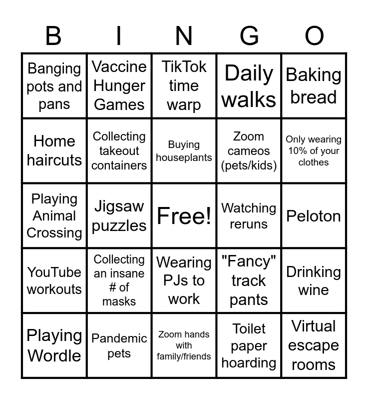 This bingo card has a free space and 26 words: Wearing PJs to work, Toilet paper hoarding, Buying houseplants, Pandemic pets, Baking bread, Banging pots and pans, Home haircuts, Vaccine Hunger Games, Peloton, "Fancy" track pants, Zoom cameos (pets/kids), Playing Animal Crossing, Drinking wine, Playing Wordle, Jigsaw puzzles, SPAM email warnings from IT, Daily walks, YouTube workouts, TikTok time warp, Virtual escape rooms, Only wearing 10% of your clothes, Zoom hands with family/friends, Watching reruns, Collecting an insane # of masks, Collecting takeout containers and Late start media conferences.